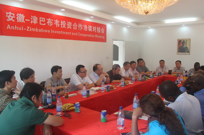 考察团一行在皖津公司举行安徽——津巴布韦投资合作洽谈对接会。依柯阮姆巴少将代表津国防部欢迎安徽客人到访,并介绍了津巴布韦经济社会发展的主要情况,面临的困难与机遇,有望合作开发的重点领域,以及安徽农垦皖津项目存在的优势与经验。卢宏世在发言中说,中津友好渊源、各自现实国情决定了双方合作的必要性和可行性,去年中国对非投资中,安徽省占了10%,足见对非洲及津巴布韦投资的重视。他希望津国防部给予更多关注与支持,并表示安徽省商务厅将一如既往地引导和帮助更多皖企赴津发展。对接会后,考察团实地察看了皖津公司合作开发项目和所属农场玉米、大豆、烟草生产及育种基地,充分肯定皖津公司在当地降雨推迟一个月的气象条件下,通过昼夜不停灌溉完成了雨季作物播种且长势喜人的良好成果。